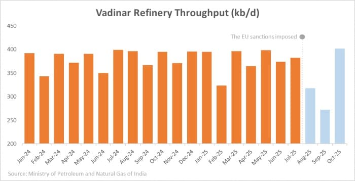 On the face of it, the pressure on Nayara was supposed to deepen when Washington sanctioned Rosneft in October. However, by late October, it became clear that Vadinar is bouncing back to strength rather than faltering. With its 400,000 b/d nameplate capacity as a benchmark, Nayara ramped up intake of Russian crude to 390,000 b/d that month, and then lifted imports further to 420,000 b/d in November to date – effectively running the plant at 105% capacity.