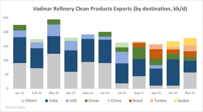 But the most striking change came from the emergence of new customers, notably Brazil and Turkey – countries that did not appear in Nayara’s client list over the past three years. In November so far, Nayara exported 21,000 b/d of clean products to Brazil and another 21,000 b/d to Turkey. These flows almost certainly reflect disruptions in Russian diesel exports after intensified Ukrainian drone strikes on Russian refineries, coupled with rising compliance risks for traders buying directly from Russia. Because Vadinar has processed exclusively Russian crude since August, its products offer these markets a politically safer, operationally simpler way to access the same molecules.